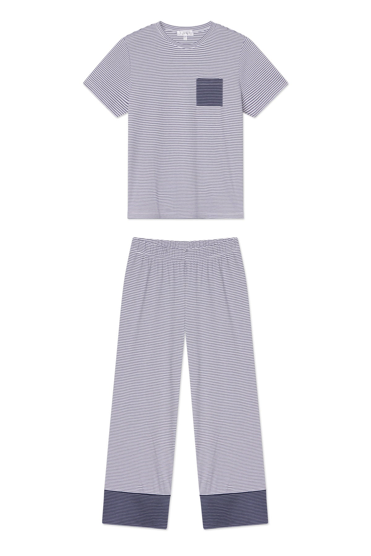 The Pima Crew Wide Leg Pajama Set in English Navy Stripe. a fine. horizontal navy and white stripe. features a fitted short-sleeve crewneck top with cropped. wide-leg pants with an elastic waistband. A contrast chest pocket and pant cuff add an eye-catching twist. Made from 100% Pima cotton.