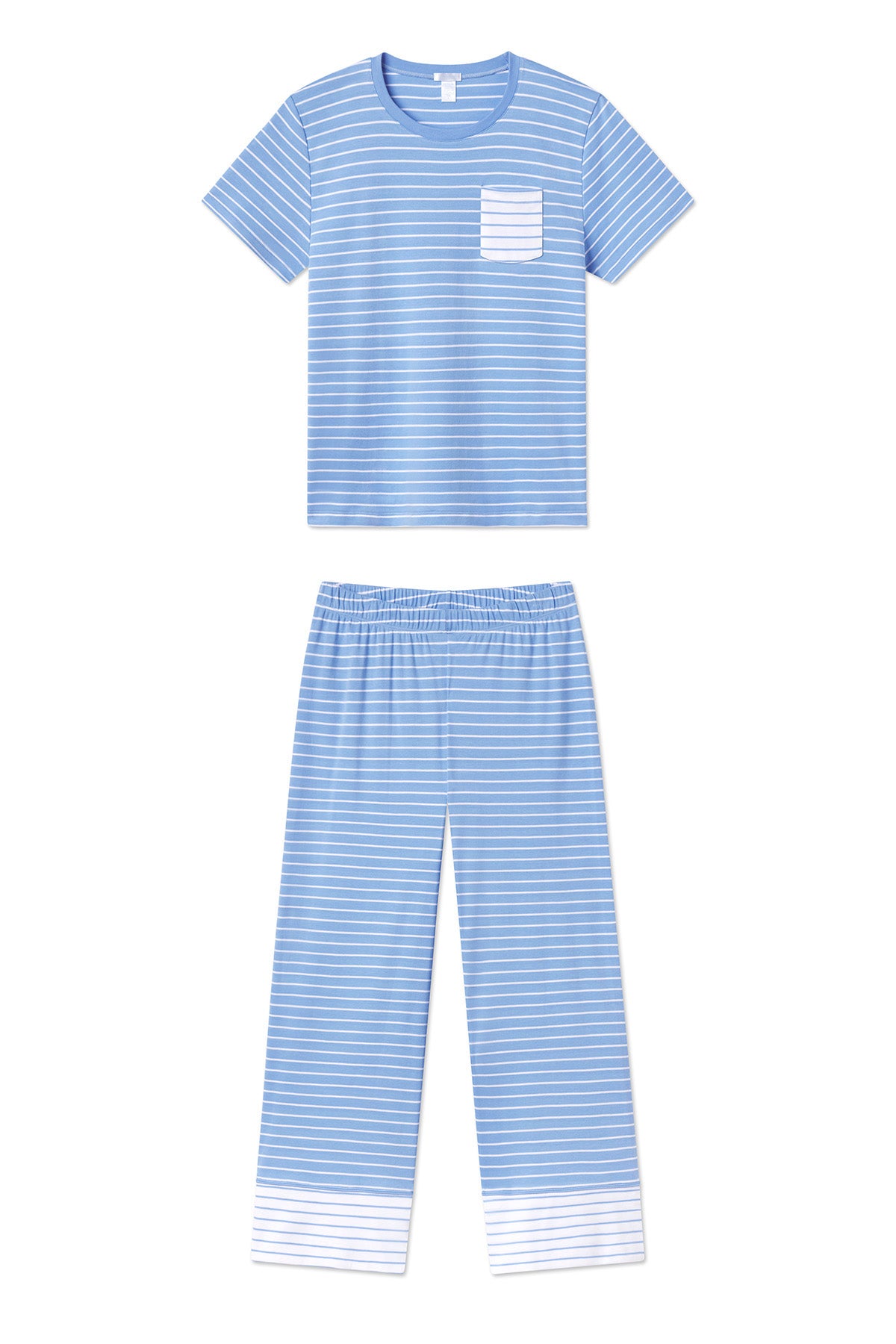 The Pima Crew Wide Leg Pajama Set in Mixed Baltic Blue Stripe. a playful palette of cornflower and white. features a fitted short-sleeve crewneck top with cropped. wide-leg pants with an elastic waistband. A contrast chest pocket and pant cuff add an eye-catching twist. Made from 100% Pima cotton.