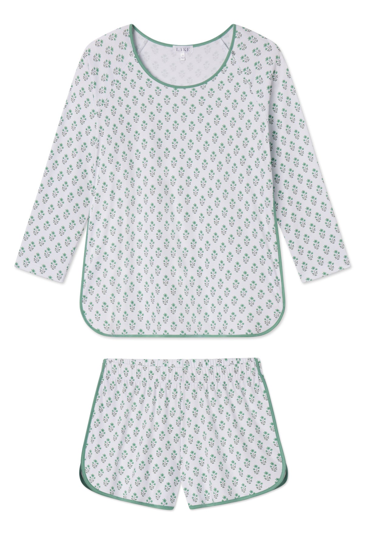 The Pima Long-Short Set in Boxwood Posy. petite. jade green bouquets set on white. features a three-quarter length sleeve scoop neck top and shorts with an elastic waistband and 3 inseam. Made from 100% Pima Cotton.