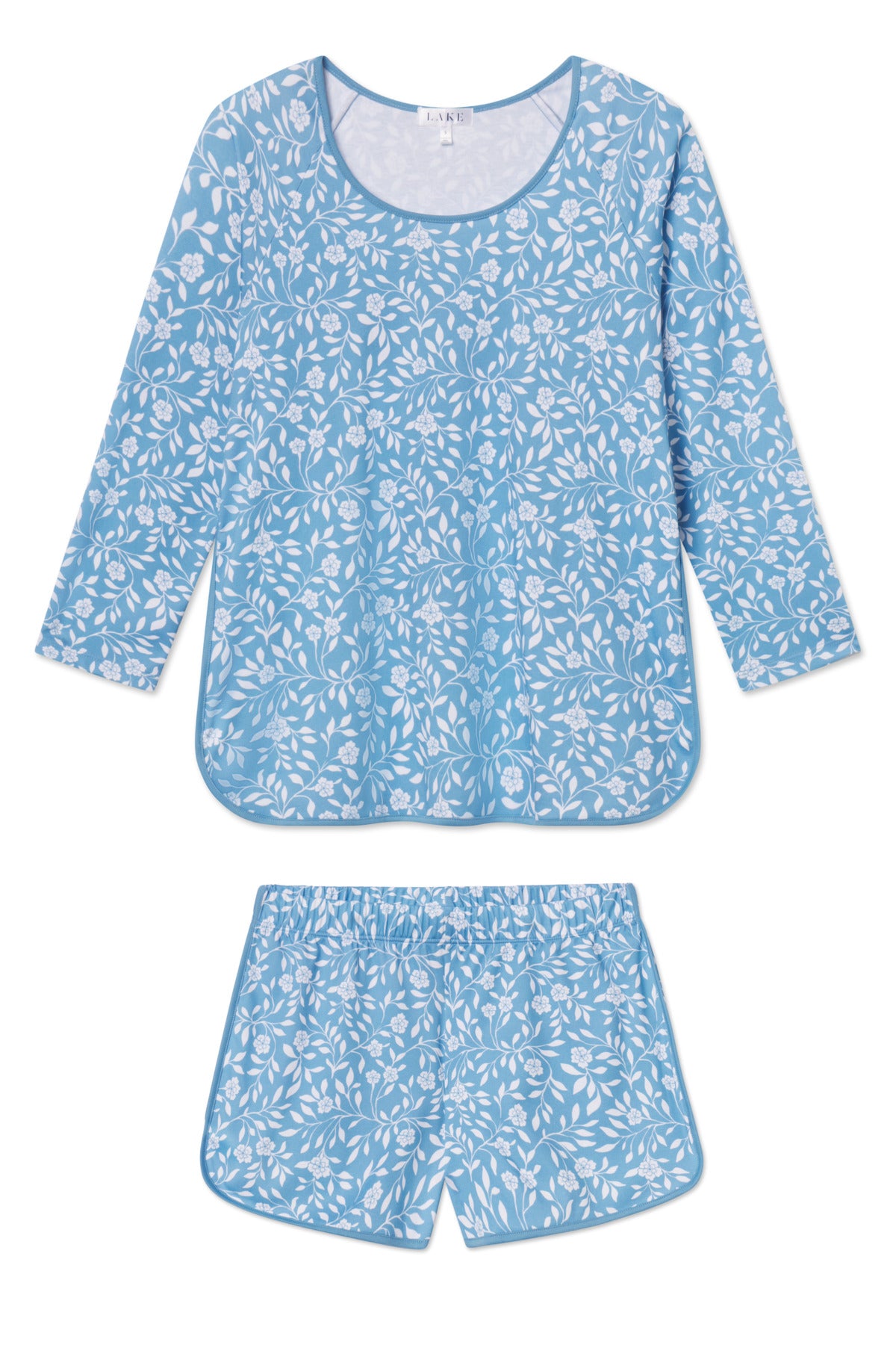 The Pima Long-Short Set in Serene Blue Cecil Floral. a white. all-over floral set on soft blue. features a three-quarter length sleeve scoop neck top and shorts with an elastic waistband and 3 inseam. Made from 100% Pima Cotton.