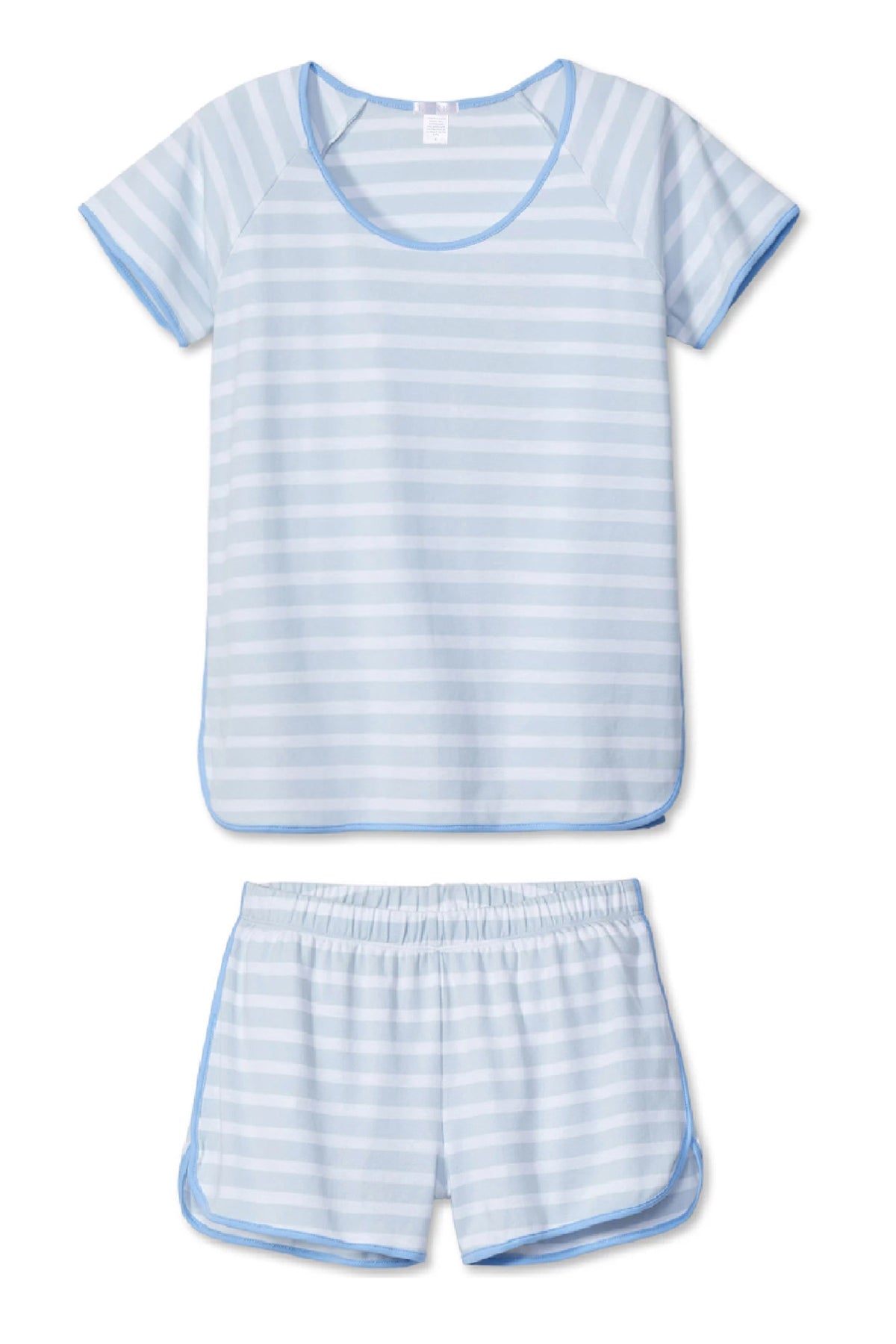 The Pima Classic Shorts Set in Seaside. a muted blue and white stripe with contrasting blue trim. features a scoop neck. short-sleeve top and shorts with a dolphin hem and elastic waistband. This soft. breathable pajama shorts set has contrast piping throughout. Made from 100% Pima cotton.